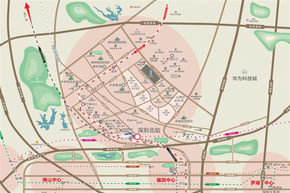 粵港澳大灣區交通樞紐,毗鄰地鐵4號線龍華站,四站換乘深圳北站,廣深港高鐵由北站到香港西九龍約18分鐘